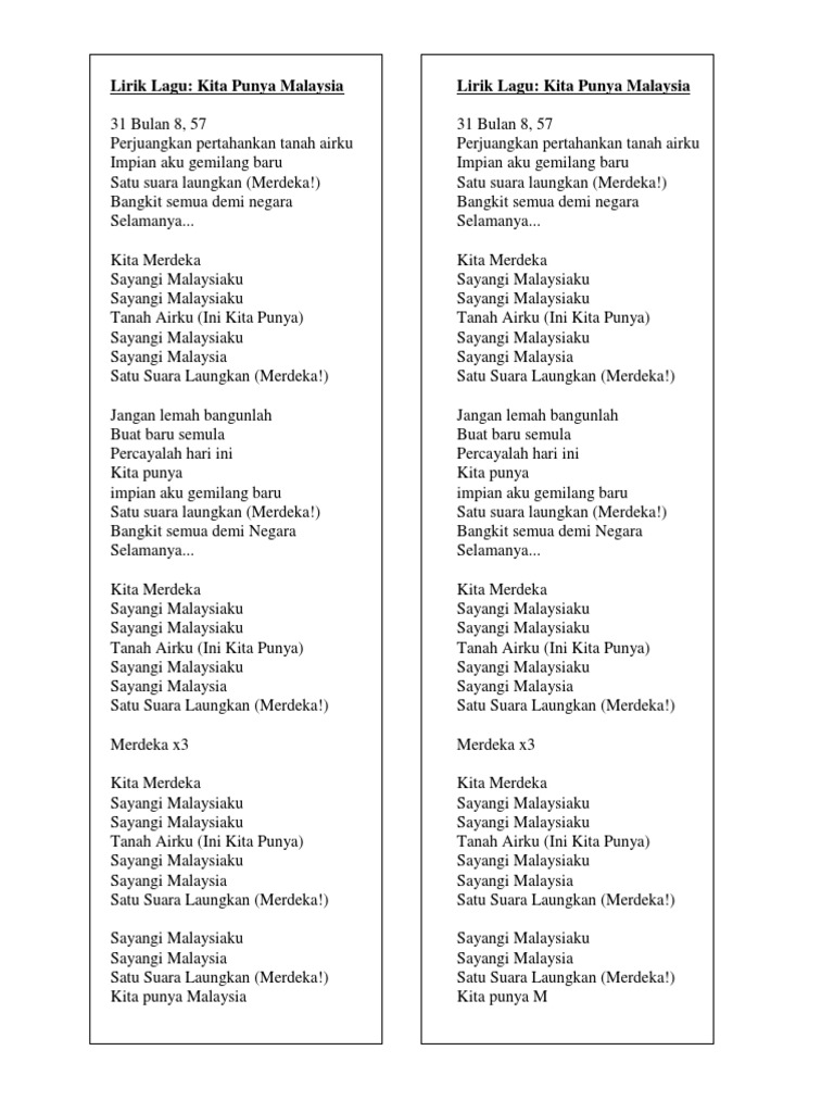 Lirik Lagu Malaysia Baru. Kita Punya Malaysia 31 Bulan 857 Perjuangkan pertahankan tanah airku Impian aku.