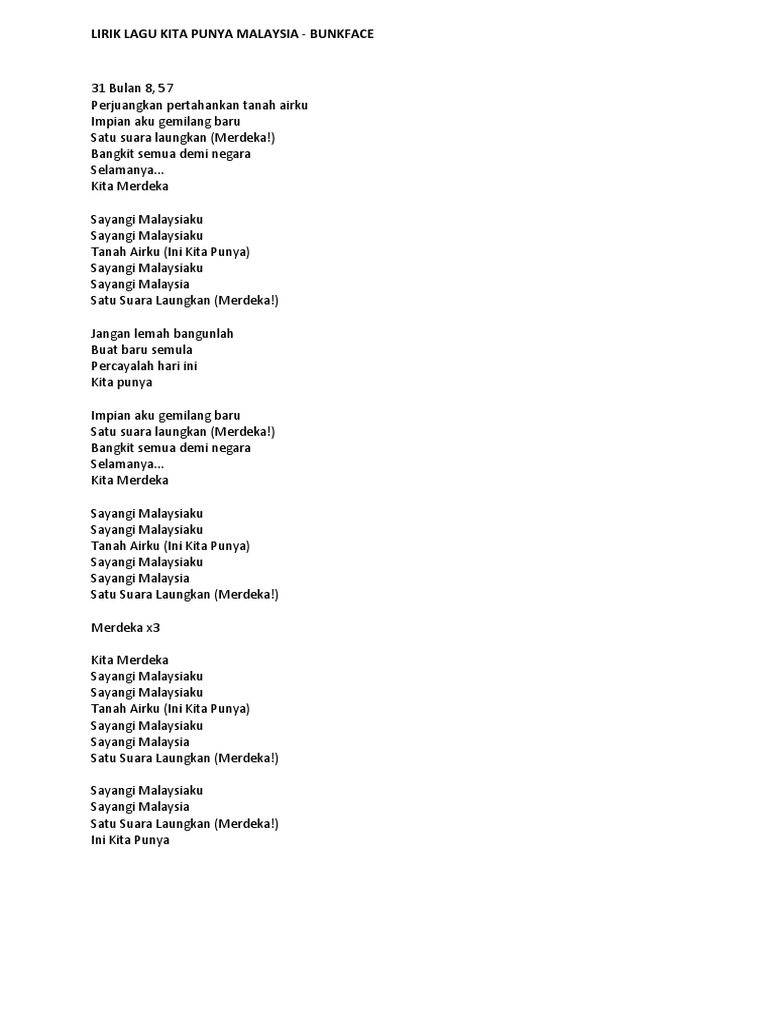 Lirik Lagu Kita Punya Malaysia - Bunkface - Lirik Lagu Kita Punya Malaysia dari BunkfaceLagu ini masih berupa single yang diedarkan oleh label Bunkface Production Sdn Bhd. 31 Bulan 8 57 Perjuangkan pertahankan tanah airku Impian aku gemilang baru Satu suara laungkan Merdeka Bangkit semua demi negara Selamanya Kita Merdeka. Lagu Sayangi Malaysia Kita Punya Malaysia memiliki makna tentang persatuan dan kesatuan negara Malaysia serta menggambarkan jati diri negara Malaysia.